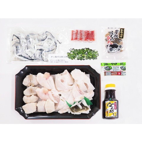 とらふぐあら・ぶつ切り計約400g、皮刺し80g、焼きひれ約4g、かぼすポン酢(鍋用)150ml、薬味(ねぎ・もみじおろし)、鍋用つゆ1袋〈大分県・養殖〉