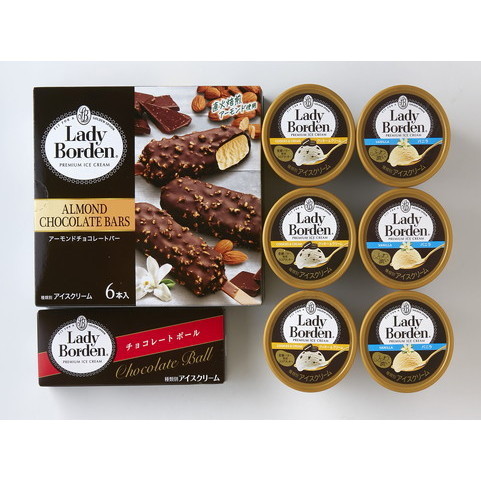 「レディーボーデン」ミニカップ(バニラ・クッキー&クリーム)各120ml×3個、「レディーボーデン」マルチアーモンドチョコレートバー(50ml×6本)×1箱、「レディーボーデン」チョコレートボール(10ml×5個入)×1箱