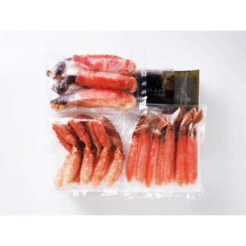 生毛蟹ポーション120g〈北海道産〉、生たらば蟹ポーション120g、生ずわい蟹ポーション120g、しゃぶしゃぶたれ15ml×4袋、昆布〈たらば蟹:ロシア・アメリカ・ノルウェー・北海道産、ずわい蟹:ロシア・カナダ・アメリカ・ノルウェー産〉