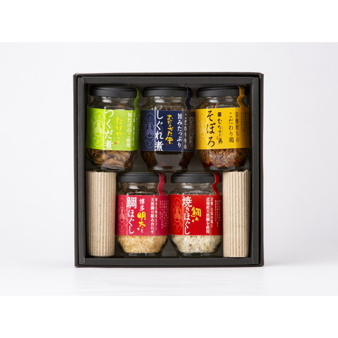 むなかた牛しぐれ煮80g、たけのこつくだ煮55g、むなかた鶏そぼろ60g、鯛の焼きほぐし50g、博多明太と鯛ほぐし50g(計5本)