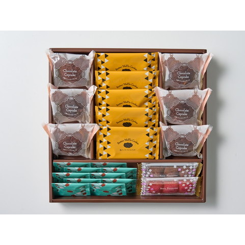 2層のチョコカップケーキ×6個、焼きショコラ×10個、焦がしバターワッフルクッキー×5枚、プチフィナンシェ (ショコラ・フランボワーズ)×各1袋(3個入)